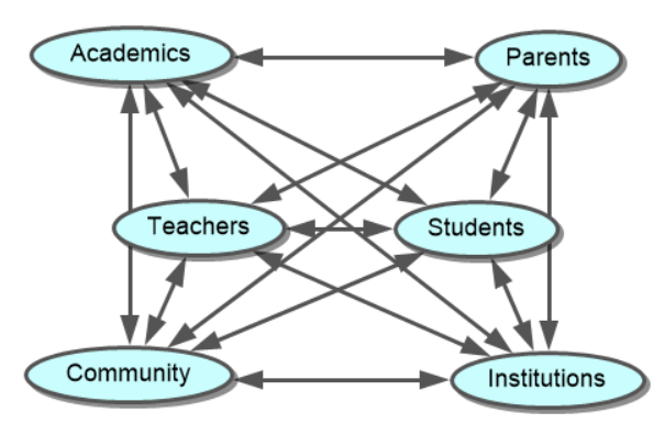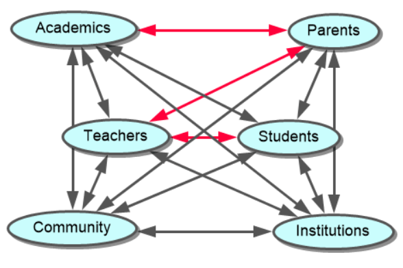 Below I tried to represent in simple fashion the very complex education system. I haven’t included commercial organisations that provide particular products for classrooms, which play an important role in our education system. My aim in showing this is to highlight the need to communicate efficiently with other elements of the system. You’ll notice that in the center of the system, I put the students and teachers, with the other elements on the periphery. This is because I think of the teacher-student relationship as the most important one when looking at a system that rests on the learning-teaching dyad.